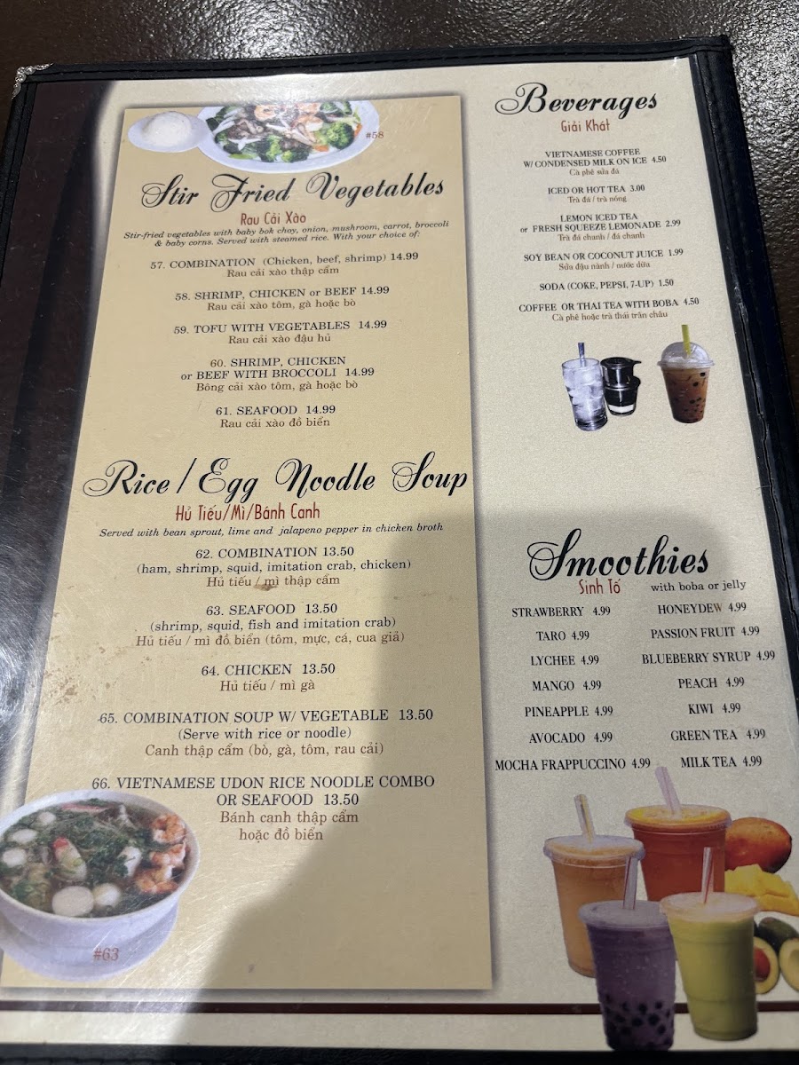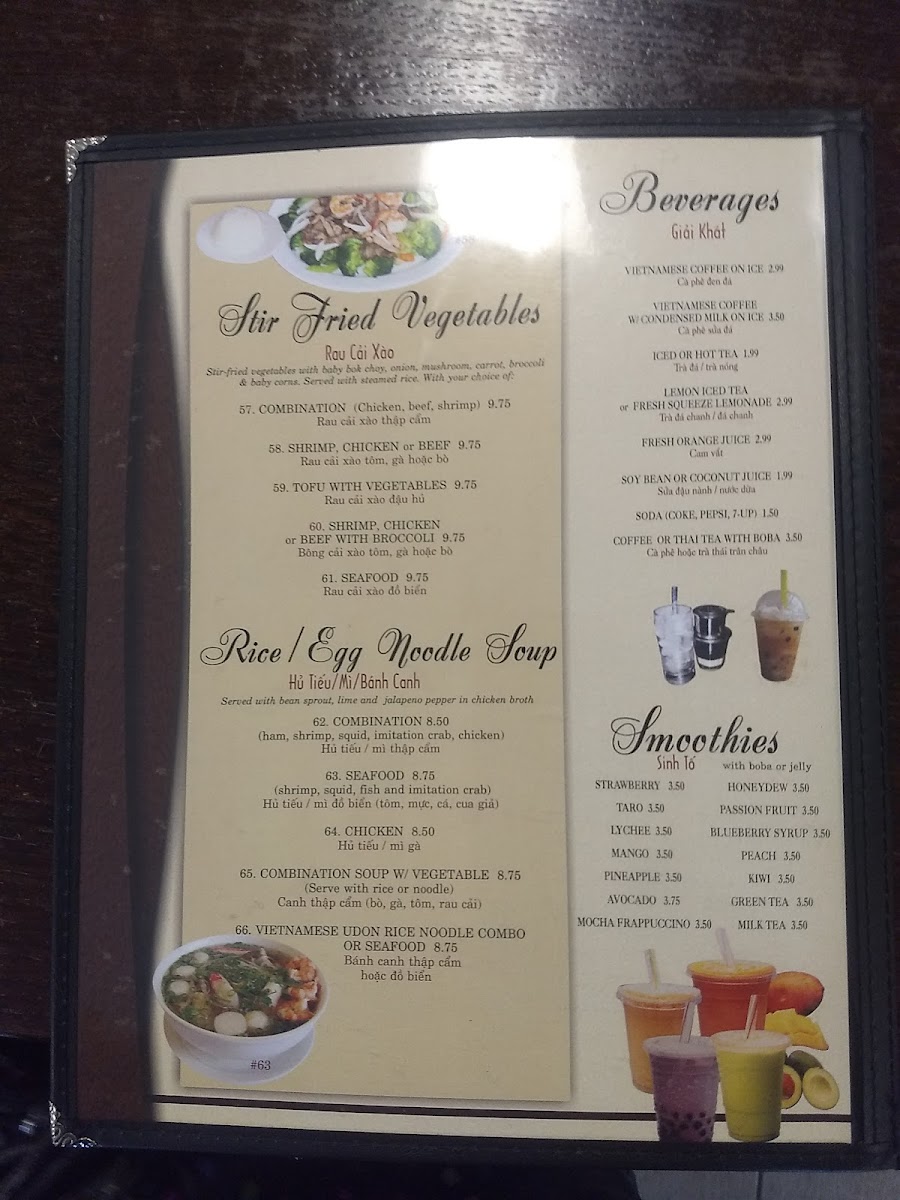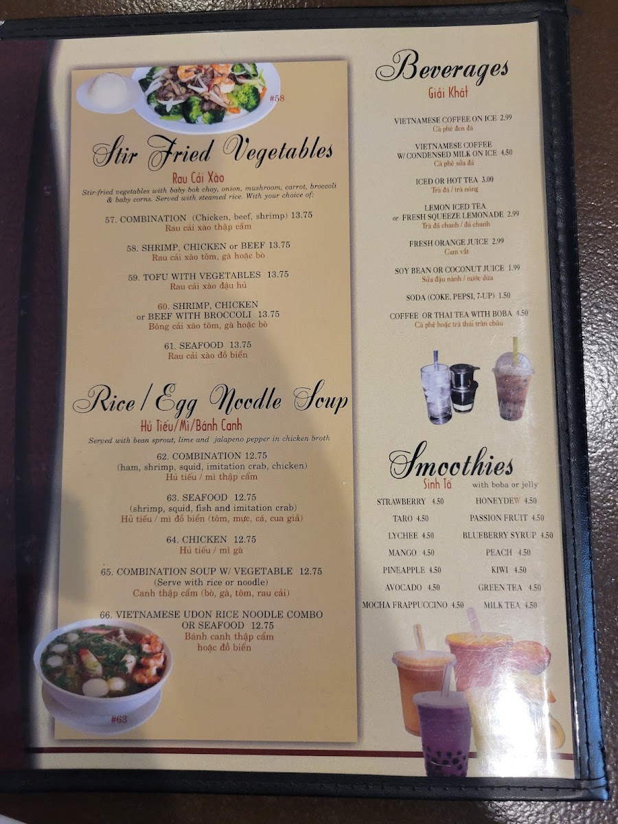 For drinks, Pho Viet offers refreshing beverages such as Vietnamese Coffee on Ice, Vietnamese Coffee with Condensed Milk, and a variety of iced teas, including Lemon Iced Tea and Fresh Squeeze Lemonade. Additionally, their Smoothies are a refreshing treat with flavors like Strawberry, Taro, and Lychee.
