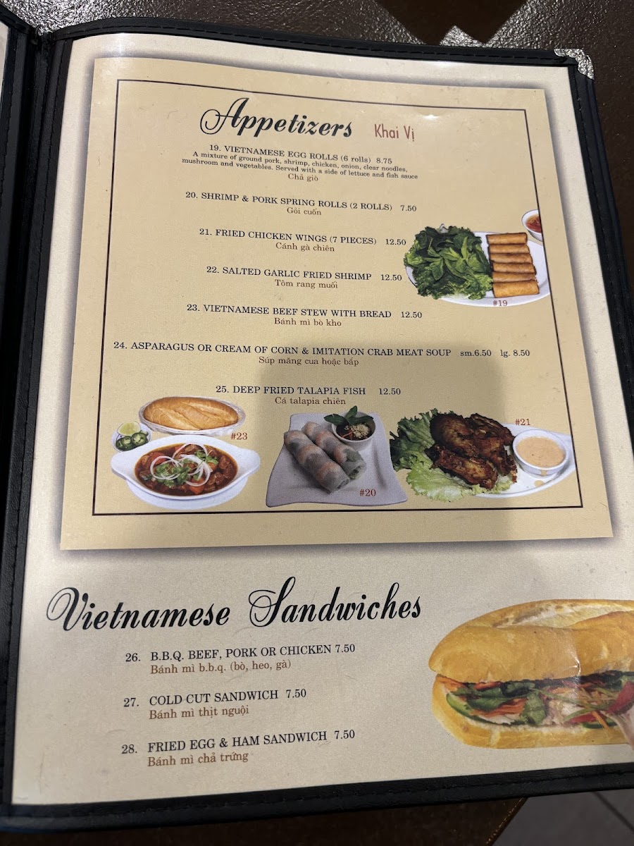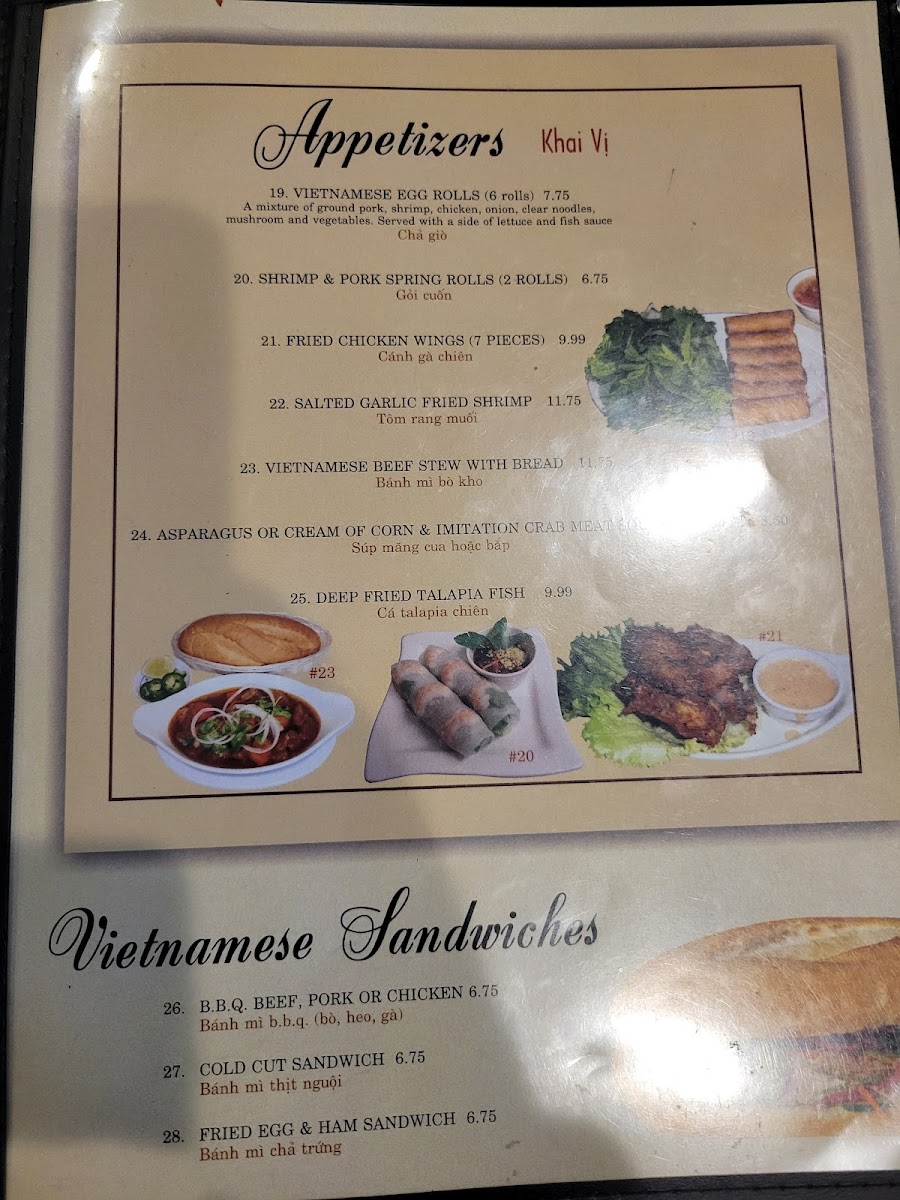 The appetizer section offers a delightful variety. The Vietnamese Egg Rolls and Shrimp & Pork Spring Rolls are perfect for sharing, while the Salted Garlic Fried Shrimp and Fried Chicken Wings provide a savory, crispy start to any meal. For a comforting and filling option, try the Vietnamese Beef Stew With Bread, which is perfect for dipping and savoring.