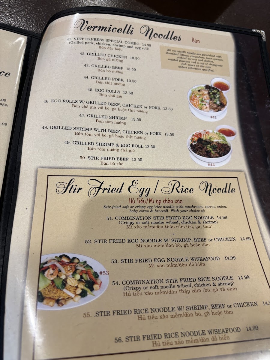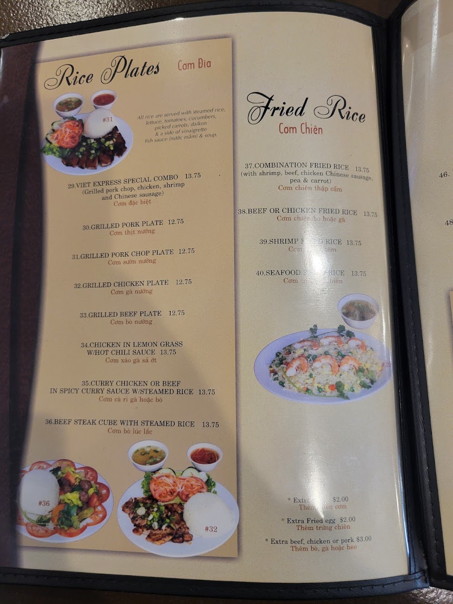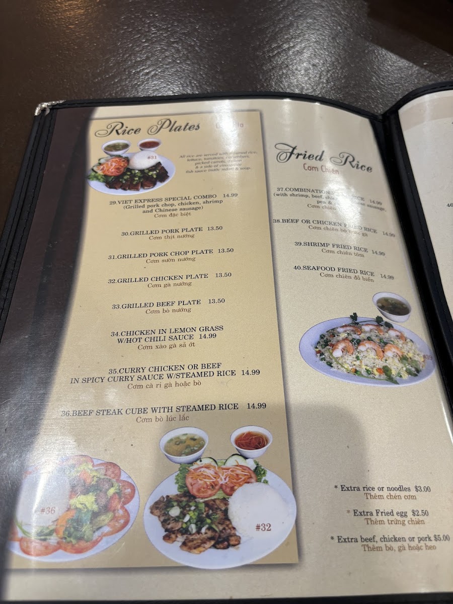 For those craving a hearty meal, their Rice Plates are a must-try. The Viet Express Special Combo and Grilled Pork Plate are two customer favorites, priced at $29 and $30 respectively. Other popular options include the Grilled Chicken Plate and the Grilled Pork Chop Plate at $32, offering perfectly grilled meats paired with fresh sides.